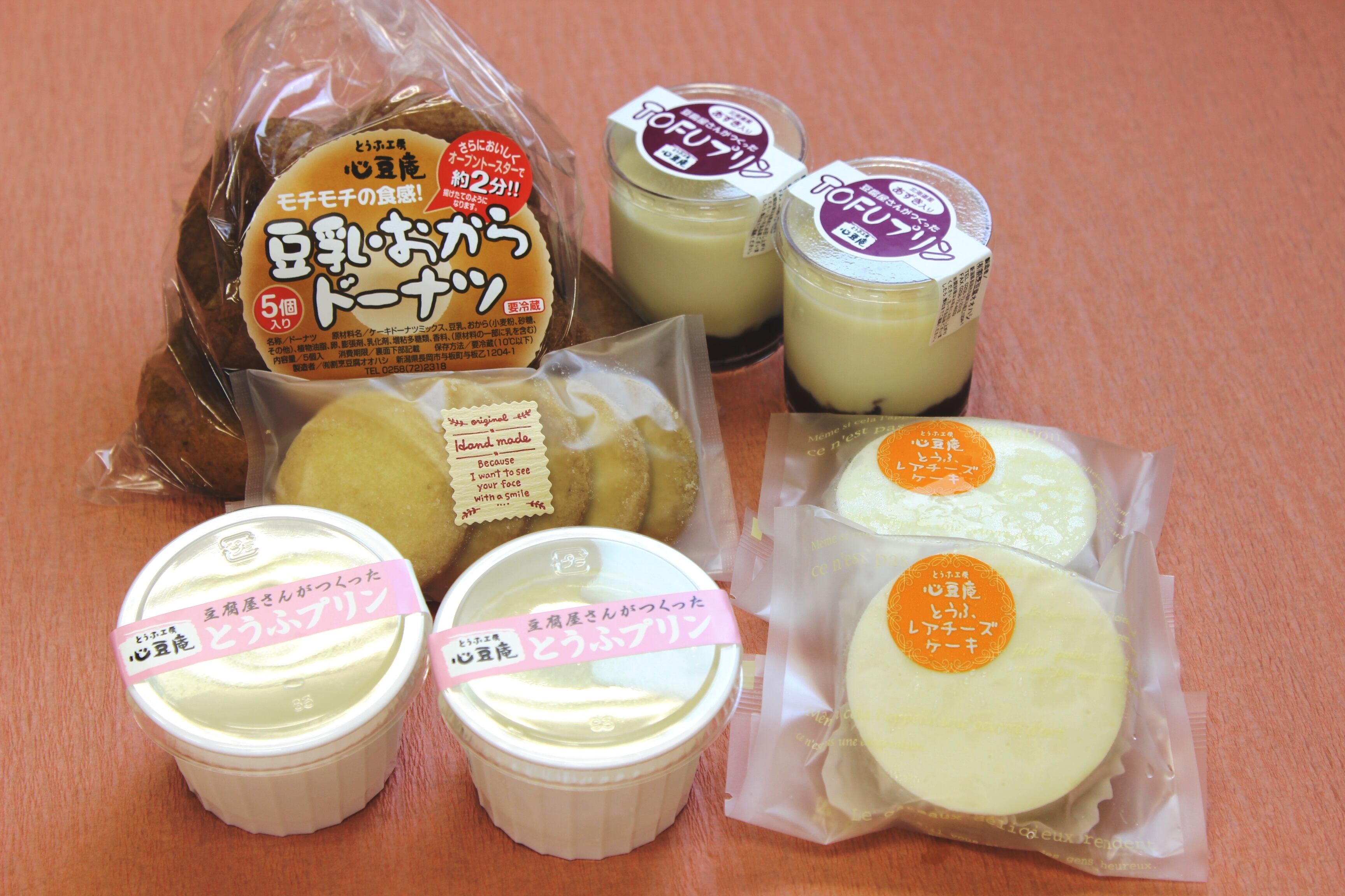 とうふプリン(プレーン)、とうふプリン(あずき入り)、とうふレアチーズケーキ、豆乳・おからドーナツ、うの花クッキー